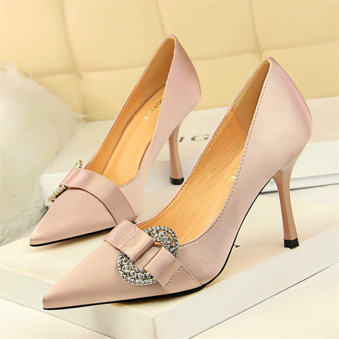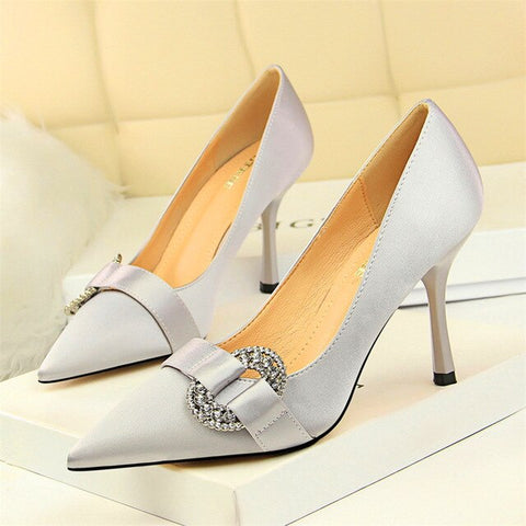 Item: Silk Shallow Pointed Toe Women Sexy Crystal Metal Buckle Party Shoes